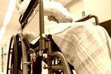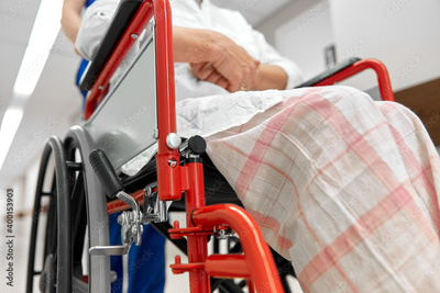 medicine, health and care concept - nurse taking senior woman patient in wheelchair at hospital corridor or nursing home