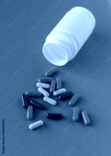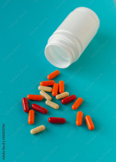 isolated pill jar mockup. antibiotic pills are scattered randomly. creative minimalistic blue abstract background banner card on the theme of coronavirus influenza virus disease