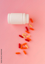 isolated pill jar mockup. antibiotic pills are scattered randomly. creative minimalistic pink abstract background banner card on the theme of coronavirus influenza virus disease