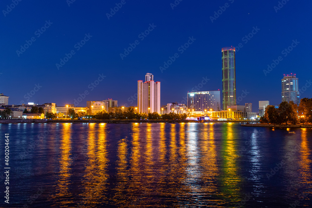 Night view of the skyscrapers of the city of Yekaterinburg. Russia. Reflection in the river