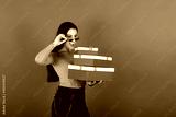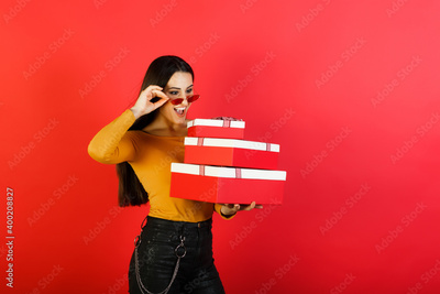 Studio portrait of excited girl while holding three big gift isolated on red background.