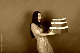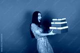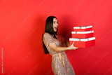 Cheerful woman in elegant dress with heavy gifts boxes isolated on red background. Valentine's Day, International Women's, Birthday or holiday concept.