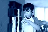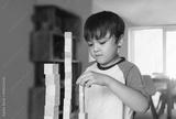 Selective focus smart kid building the tower stack from wooden blocks toy, Happy Child boy playing stack of wood cube in living room,Children Play and learn about construction at home,Home schooling