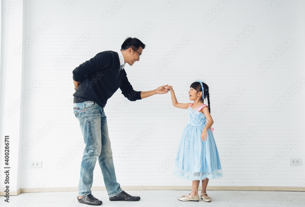 Father is teaching his little daughter to dance in the halls of the house. Happy holidays, family relationships.