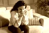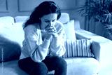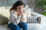 Depressed young woman on sofa at home.