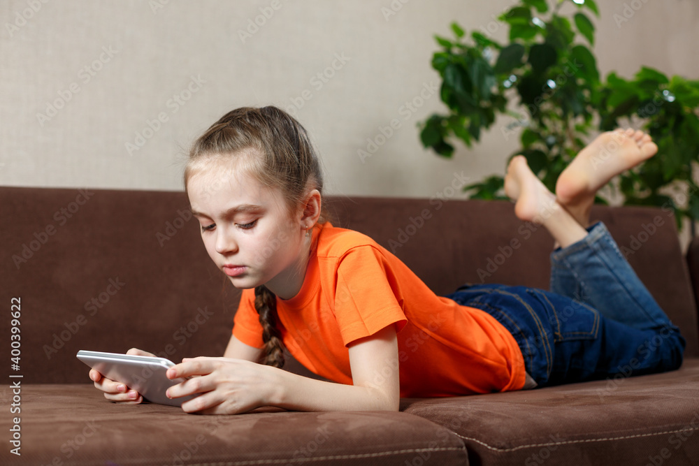 Education, Free Time, Technology and Internet Concept - Little Girl With Tablet Pc At Home
