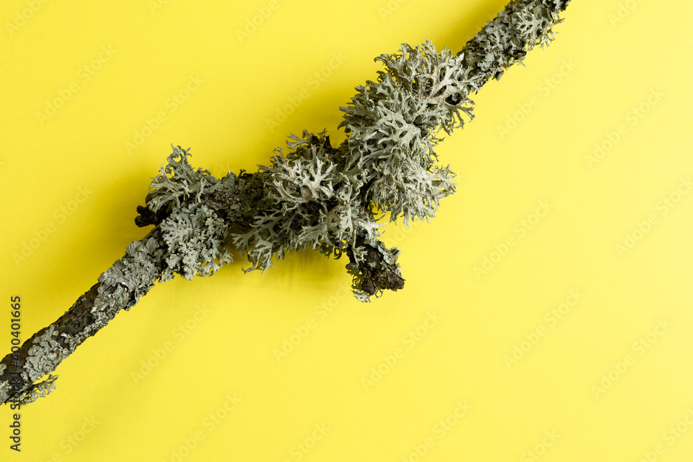 Creative photo of a pine branch with lichen (Hypogymnia physodes) on Illuminating Yellow background