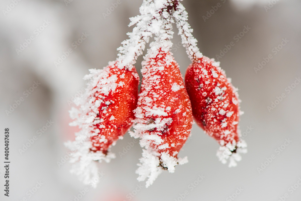 Hagebutten im Frost und Raureif im Winter