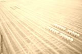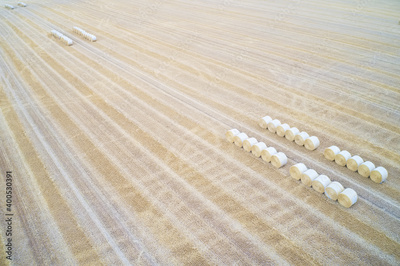 Hay crop bales rolled in field by farmer on farm for harvesting