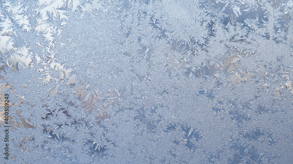 Ice and frost on the window glass in winter. A pattern of frozen water crystals, similar to the leaves of fantastic plants or jewels. Light blue backdrop. Abstract natural background or wallpaper