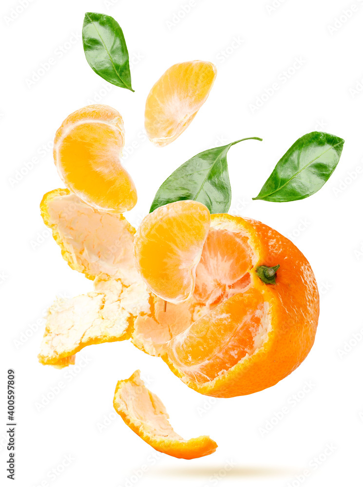 Peeled tangerine slices, leaves and rind fly on a white background, isolated. Levitating Mandarin