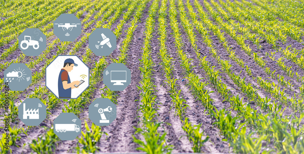 Smart Agriculture concept. Grain production with modern farming technologies. Wireless communication icons. Green corns with background. The farmer works agricultural jobs remotely by mobile phone