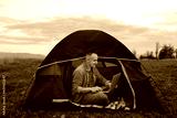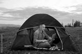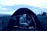 Man working on laptop in tent in nature. Young freelancer sitting in camp. Relaxing in mountains. Remote work, outdoor activity in summer. internet 5G.