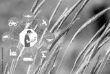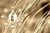 Smart Agriculture concept. Grain production with modern farming technologies. Wireless communication icons. rye field with background. The farmer works agricultural jobs remotely by mobile phone