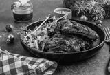 Homemade barbecued ribs seasoned with a spicy basting sauce. Christmas concept
