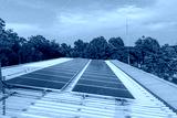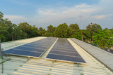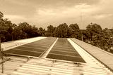 solar cells panel installed on the roof of a large building are full of dirt and dust.