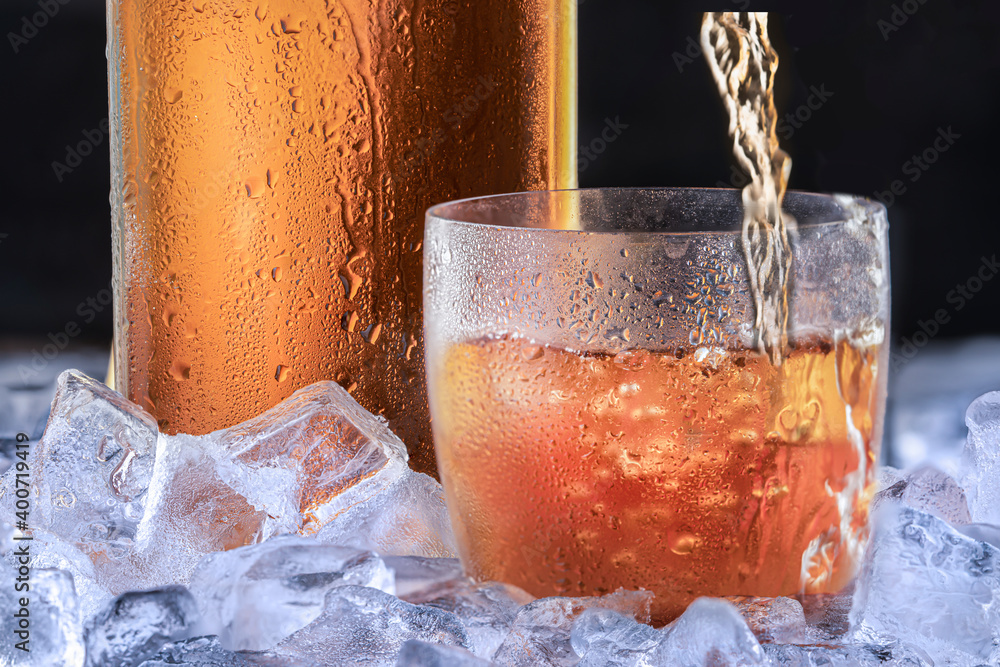 whiskey or Bourbon in a frosted glass with ice. alcoholic beverage. Pour Scotch into a glass with ice, drops