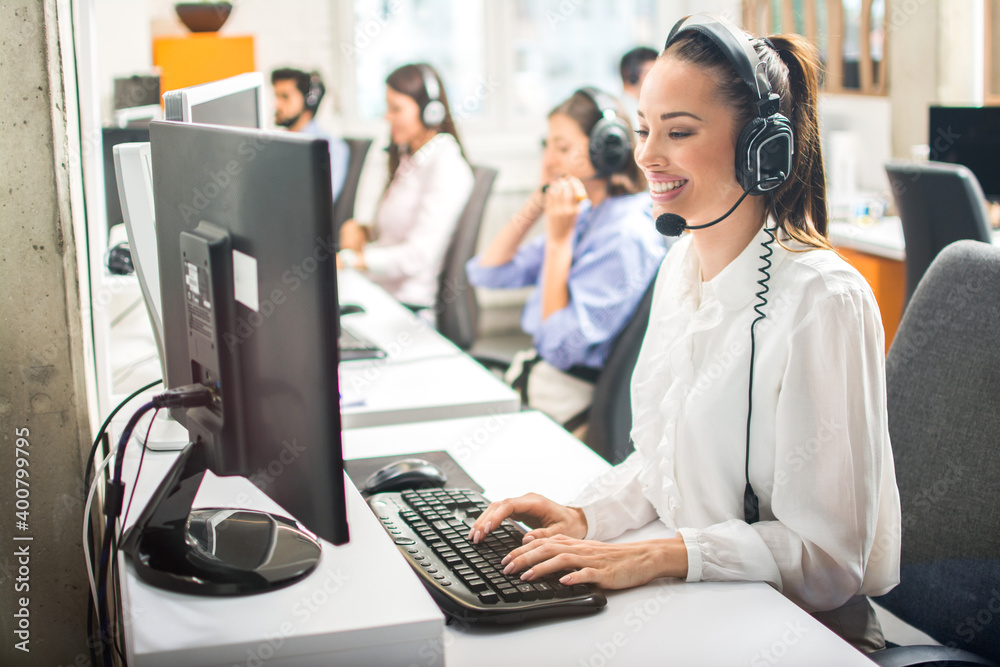 Attractive and beautiful woman customer service operator in headsets at work in office. Business concept.