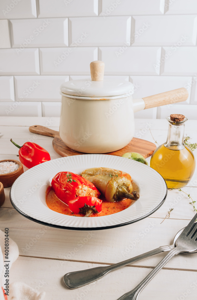 Pepper stuffed with minced chicken meat and rice in a white plate on a white wooden table.
