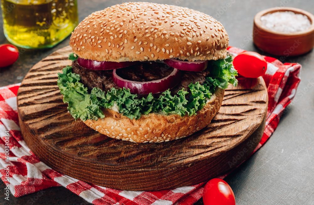 Homemade burger with black angus beef meat and fresh vegetables on a wooden board.