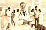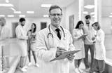 An elderly handsome smiling doctor in a medical uniform with a stethoscope stands in the corridor of the clinic and makes notes against the background of the medical team.