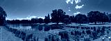 Beautiful view of a pond with lily pad in the water and tall trees and deep blue sky in the background, Centennial park, Sydney, New South Wales, Australia