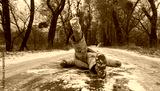 Child girl is lying on the road, downfall and accident on winter season, black ice. Risk of accidents in winter - A woman slipped on a snow slippery road