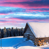 Fantastic winter landscape with wooden house in snowy mountains. Christmas holiday concept. Carpathians mountain, Ukraine, Europe