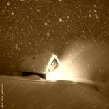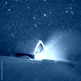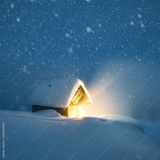 Fantastic winter landscape with wooden house in snowy mountains. Christmas holiday concept