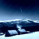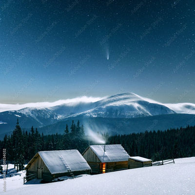 Fantastic winter landscape with wooden house in snowy mountains. Starry sky with Milky Way and snow covered hut. Christmas holiday and winter vacations concept