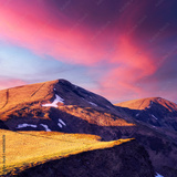 View of the grassy hills in Carpathian mountains glowing by evening sunlight. Dramatic spring scene. Landscape photography