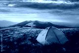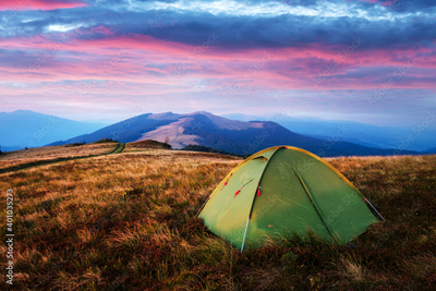 Green tent in spring mountains. Amazing evening highland. Landscape photography