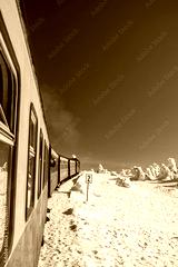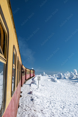Harz national park Germany, Steam train on the way to Brocken through the winter landscape, Famous steam train through the winter mountain. Brocken, Harz National Park Mountains in Germany Europe