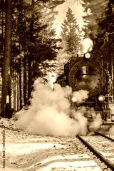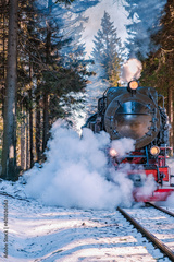 Harz national park Germany, Steam train on the way to Brocken through the winter landscape, Famous steam train through the winter mountain. Brocken, Harz National Park Mountains in Germany Europe