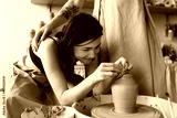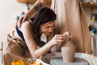 Loving couple man and woman in pottery studio, dating in ceramics workshop
