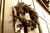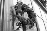 Christmas wreath of red berries, cones and Christmas tree branches on the door.
