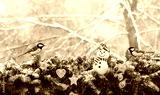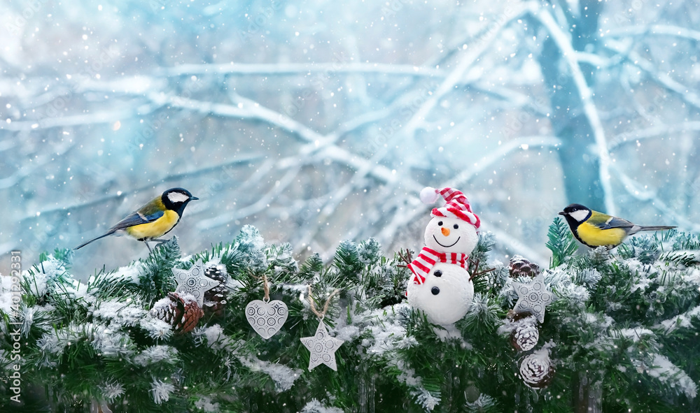 Tit birds and cute snowman on winter nature background. Christmas and new year concept. winter holiday season. birds titmouse in snowy garden
