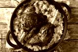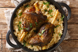 Haneeth is a slow roasted lamb dish from Yemen served on a plate of rice closeup on the table. horizontal top view from above