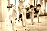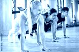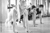 Group of sporty people performing push up or plank exercise at gym.