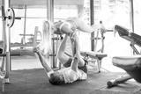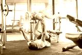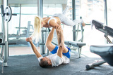 Strong man bodybuilder lying on his back and lifting a blonde fitness girl over his legs at gym.