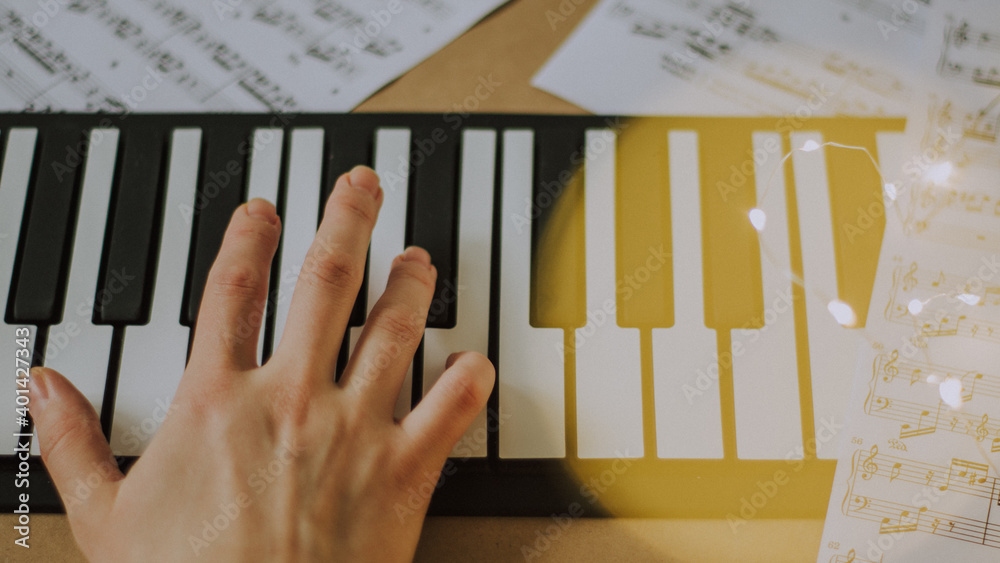 Hands playing piano keys on electric keyboard with warm christmas lights bokeh