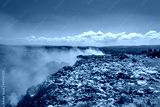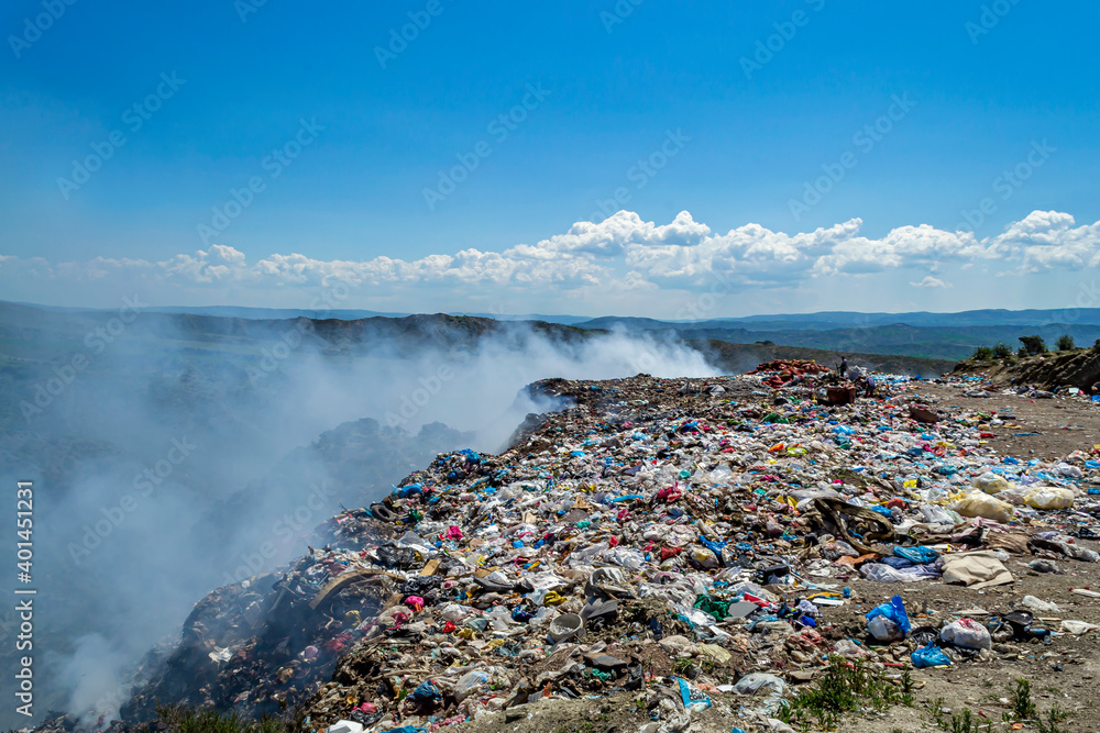View of garbage field in trash dump or open landfill, food and plastic waste products polluting in a trash dump, Workers hands sorting garbage for recycling.