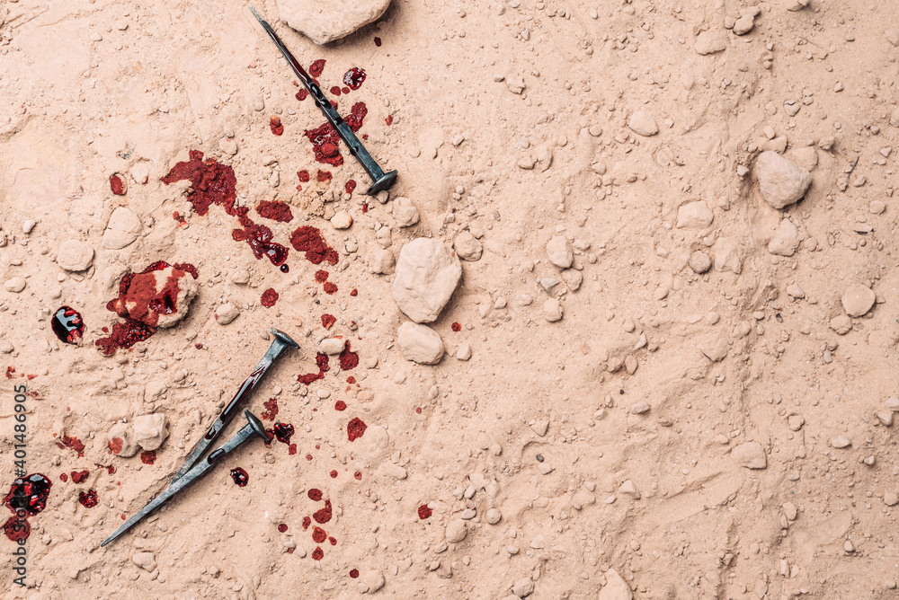 Bloody nails on ground. Banner. Copy space. Good friday. Passion, crucifixion of Jesus Christ. Christian Easter holiday. Gospel, salvation
