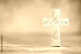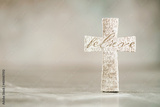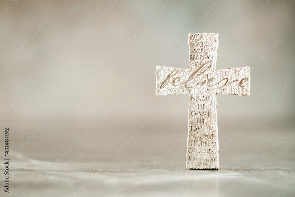 Stone cross with inscription Believe on grey background, Copy space. Christian backdrop. Biblical faith, gospel, salvation concept