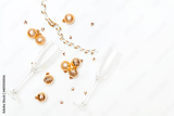 Festive christmas or new year banner flat lay with gift box, golden decorative balls, ribbon and champagne glasses on white background