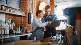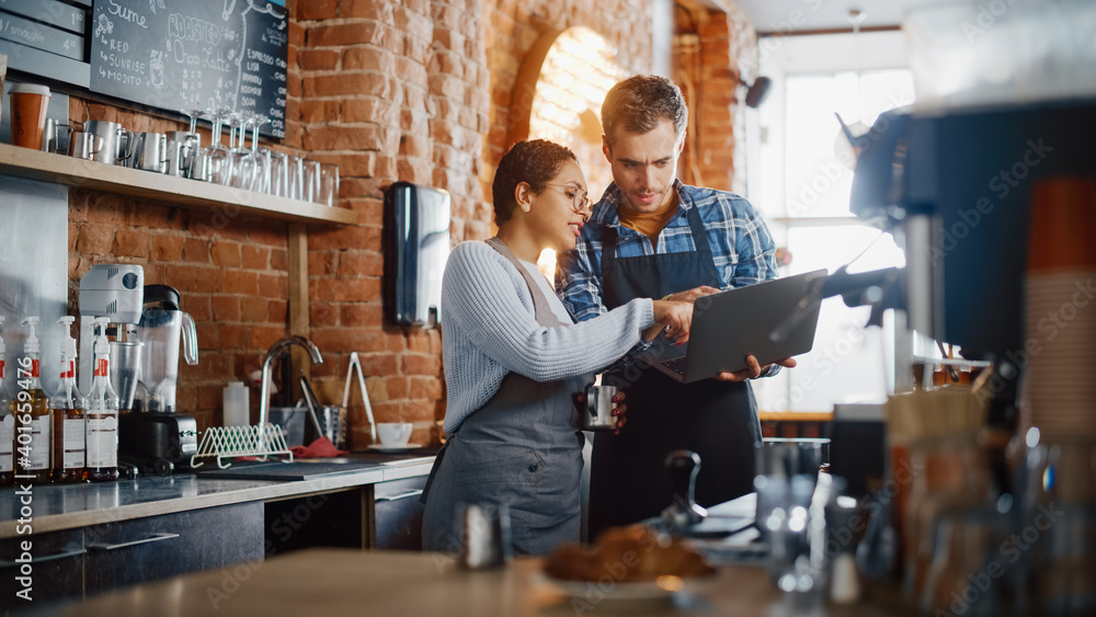 Two Diverse Entrepreneurs Have a Team Meeting in Their Stylish Coffee Shop. Barista and Cafe Owner Discuss Work Schedule and Menu on Laptop Computer. Multiethnic Female and Male Restaurant Employees.