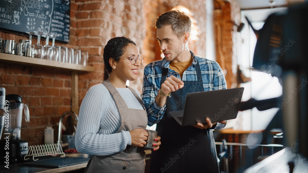 Two Diverse Entrepreneurs Have a Team Meeting in Their Stylish Coffee Shop. Barista and Cafe Owner Discuss Work Schedule and Menu on Laptop Computer. Multiethnic Female and Male Restaurant Employees.