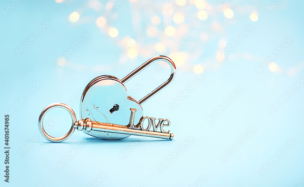 key and Heart padlock on blue background. February 14, Valentine's day concept. symbol of love, true feelings, wedding, reliability of relationship