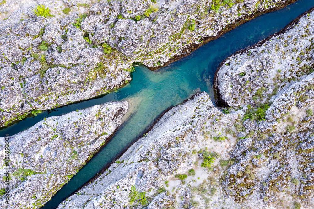 Fork of a narrow mountain river flowing through bare rocky landscape. Stream bed cut deep into rock. Upstream of Cijevna (Cem) in Montenegro. Aerial top down view.