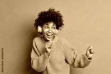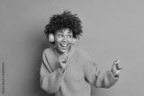 Happy curly haired fro American teenager dances carefree and sings favorite song listens music in headphones enjoys sound pleasant melody looks positively aside moves against purple background.
